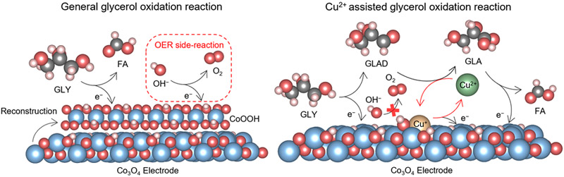 甘油氧化作為生物質(zhì)平臺(tái)分子增值的重要途徑,其氧化產(chǎn)物廣泛應(yīng)用于制藥、食品、化妝品和紡織等行業(yè)。然而,傳統(tǒng)熱催化甘油氧化過(guò)程依賴高溫高壓的反應(yīng)條件,使用有毒氧化劑和溶劑,污染大、能耗高,限制了其可持續(xù)發(fā)展。面對(duì)國(guó)家“雙碳”戰(zhàn)略目標(biāo)及綠色發(fā)展的迫切需求,電催化甘油氧化(GOR)技術(shù)應(yīng)運(yùn)而生。該技術(shù)以水為氧化劑,以綠色電能為能量輸入,不僅為甘油綠色氧化升級(jí)提供了新路徑,還可替代電解水制氫過(guò)程中的高能耗析氧反應(yīng),降低系統(tǒng)能耗,實(shí)現(xiàn)在生產(chǎn)高值化學(xué)品的同時(shí)高效制備綠氫,具有顯著的科學(xué)研究?jī)r(jià)值與應(yīng)用前景。