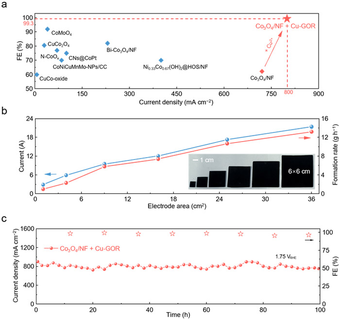 針對(duì)該挑戰(zhàn),中國(guó)科學(xué)院金屬研究所太陽(yáng)能與氫能材料研究團(tuán)隊(duì)提出了一種通過(guò)引入Cu2+抑制過(guò)渡金屬氧化物表面非晶化的新策略(Cu-GOR)。相關(guān)研究結(jié)果表明,在電解液中添加微量Cu2+(相當(dāng)于反應(yīng)物濃度的1%),利用Cu2+/Cu+在電催化氧化過(guò)程中的可逆氧化還原,可有效維持催化材料晶體結(jié)構(gòu)的穩(wěn)定性,抑制過(guò)渡金屬氧化物催化材料的表面非晶化過(guò)程。以泡沫鎳負(fù)載Co3O4催化材料為例,在800 mA cm?2的工業(yè)級(jí)電流密度下,Cu2+的引入使目標(biāo)產(chǎn)物甲酸的法拉第效率從62.2%提高至99.3%,性能顯著優(yōu)于已報(bào)道的催化材料。同時(shí),該催化材料和反應(yīng)體系易于放大,6×6 c㎡電極材料的甘油氧化產(chǎn)物收率達(dá)到13.2 g h?1,穩(wěn)定性超過(guò)100小時(shí)。該策略還可擴(kuò)展至其他過(guò)渡金屬氧化物(如鎳基材料)及多種生物質(zhì)電氧化反應(yīng)體系(如5-羥甲基糠醛電氧化),為推進(jìn)生物質(zhì)電催化技術(shù)在綠色氫能產(chǎn)業(yè)中的應(yīng)用提供了新思路。