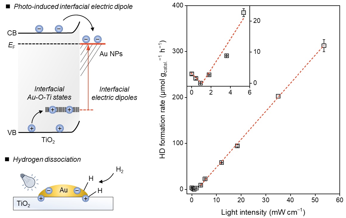 科研人員以金/二氧化鈦(Au/TiO2)為模型催化劑,利用紫外光激發(fā)TiO2,研究結(jié)果認(rèn)為:光激發(fā)產(chǎn)生的電子可遷移到Au納米顆粒上而被束縛;同時(shí),由于Au納米顆粒和TiO2的界面存在Au-O-Ti組成的缺陷態(tài),光生空穴會在界面處被捕獲。研究發(fā)現(xiàn),由于空穴和電子分別在界面Au-O-Ti和Au納米顆粒上,從而形成了空間鄰近的束縛態(tài)電子-空穴對。Au/TiO2在常溫條件下同時(shí)存在氫氣異裂的熱催化機(jī)制,與Au/TiO2上光催化氫氣異裂的機(jī)制疊加,使科研人員觀察到該反應(yīng)活性隨著光強(qiáng)增強(qiáng)先降低后呈線性增加的現(xiàn)象。